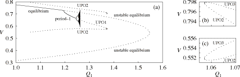 Fig. 10. Bifurcation diagrams showing intersection of solution trajectories with hyperplane of ωr = 1 (dωr/dt < 0), projected onto V, dotted lines represent unstable equilibria or unstable limit cycles. Equilibria, attractors, unstable period-1 orbit (UPO1), and unstable period-2 orbit (UPO2), which causes a voltage collapse, are shown in (a). The unstable period-2 orbit (UPO2) and the other unstable period-2 orbit (UPO3) are shown in (b) and (c).