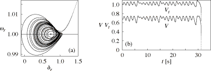 Fig. 7. Voltage collapse at Q1 = 1.26289: (a) projected onto the space with coordinates δr and ωr; (b) V and Vt vs. t.