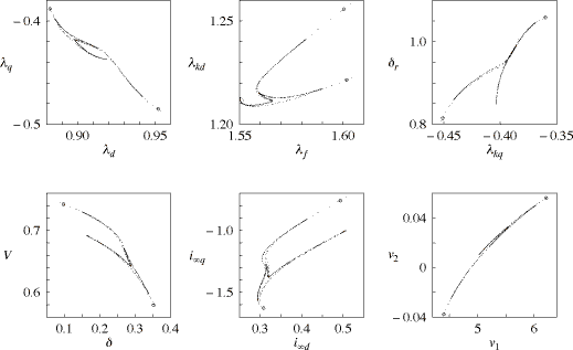 Figure 9 shows Poincare maps, where the phase-space coordinate is taken by sampling twelve variables when ωr crosses 1 in the decreasing direction. The pair of large circles in the each figure denotes the saddle point for the map corresponding to the unstable period-2 orbit. Many small dots in the each figure indicate the transient chaotic orbit which touches the unstable period-2 orbit and finally tends toward a voltage collapse. We can confirm by Fig. 9 that the saddle point corresponding to the unstable period-2 orbit is the boundary of a voltage collapse.